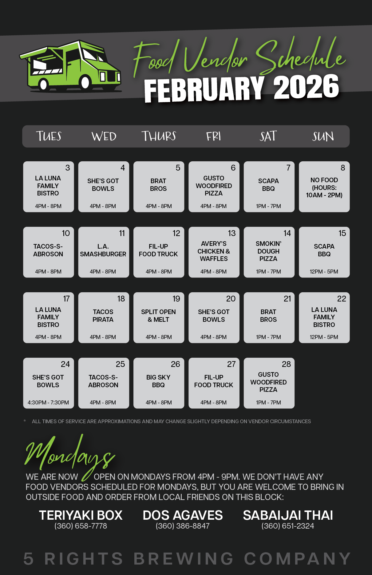 The most important thing to remember is that 5 Rights Brewing is not going anywhere. We will continue to work tirelessly to brew the exceptional beer you have come to expect and enjoy while continuing to provide a welcoming community gathering place that will make you feel at home. Although we will not be operating our own kitchen we will be featuring guest food vendors/trucks onsite Tuesday-Sunday. We are thankful to have a fantastic group of food vendors that will be providing delicious food for our guests. We will be publishing full-month schedules on our website of who will be onsite as well as posting weekly calendars and daily reminders on our social media accounts so you can see who will be onsite. Although we would love for you to patronize the other small business vendors we are bringing in you are also free to bring whatever outside food that you like to our taproom.